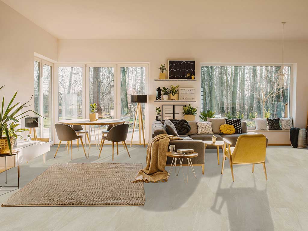 Die Vinylfl iesen im XL-Format sind mit integrierter Trittschallunterlage erhältlich und überzeugen mit ihrer supermatten und täuschend echten Steinoptik sowie realen 4V-Fuge. Damit passen sie perfekt in jede Räumlichkeit. Mit einer Nutzungsklasse von 33 sind sie ideal für stark beanspruchte Räume im Wohn- und Gewerbebereich.