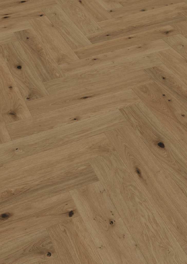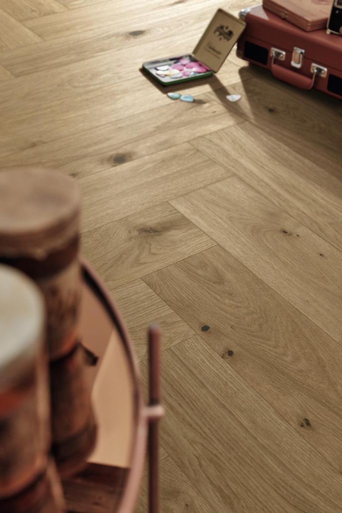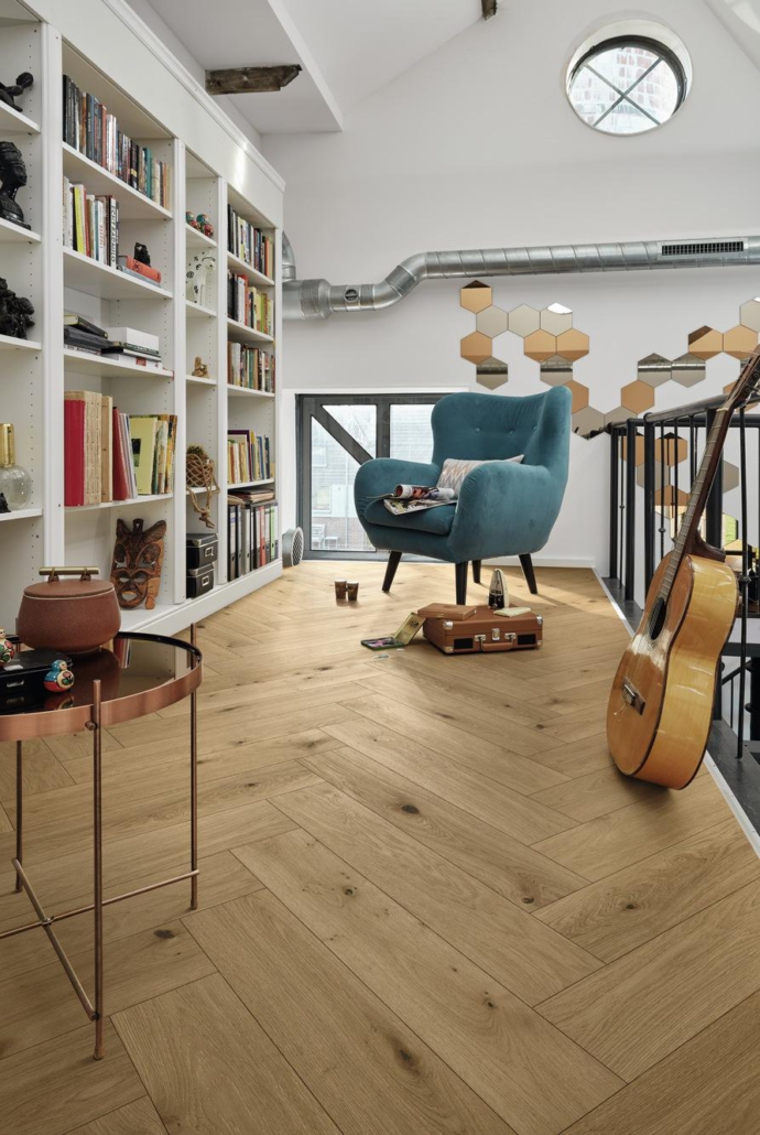 Das Fischgrät ist ein klassisches Verlegemuster mit langer Geschichte – und seit einiger Zeit wieder absolut im Trend. Kein Wunder, bietet es doch die perfekte Mischung zwischen elegant und modern, denn PS 500 übersetzt das klassische Verlegemuster mit dem großformatigen Stabformat in die Gegenwart. Durch das ultramattlackierte Finish, das jede einzelne Pore benetzt, wirkt der Boden nicht nur extra edel und natürlich, sondern ist auch besonders pflegeleicht, fleckenunempfindlich und resistent gegen Mikrokratzer (kleine Kratzer in der Lackoberfläche, die nicht bis zur Echtholzdeckschicht durchdringen).